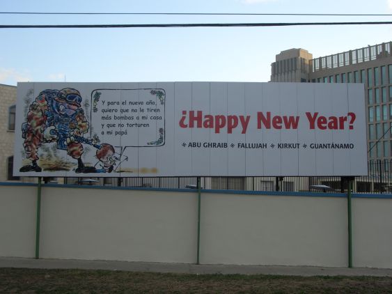 Die schönen hier eingebetteten Bilder stammen übrigens aus Havanna, Februar 2005: die kubanische Regierung hat die entsprechenden Plakatwände genau gegenüber der Ständigen Vertretung der USA aufgestellt. Diese Bilder hat mensch in den deutschen Massenmedien bestimmt nicht gesehen.