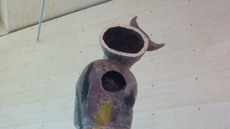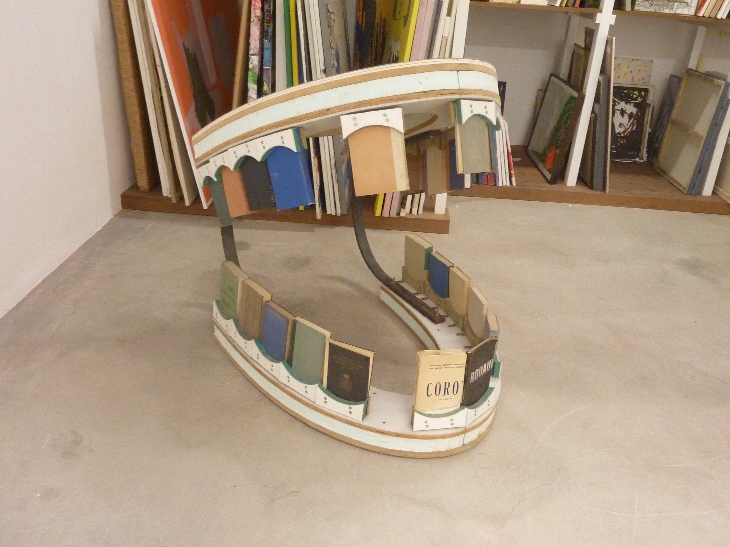 Die Ausstellung selbst sieht aus wie ein ganz putziger Kramladen. (Obgleich ich glaube, dass Hunderte von Künstlergenerationen auf ihren Atelierfesten das witziger, schlagkräftiger, mutiger gemacht haben.) Ein dicker ausgestopfter Matrose hängt an der Decke und schaut selig auf das Getümmel von alten Hutschachteln, Pappkartons, verrosteten Nägeln, sehr unpassend angebrachten Gebissen und Malgemälden herunter. Es ist ziemlich still in der kleinen Ausstellung, und entrüsten tut sich eigentlich auch niemand mehr. Dada – – na ja.