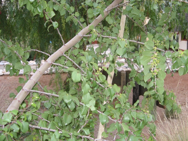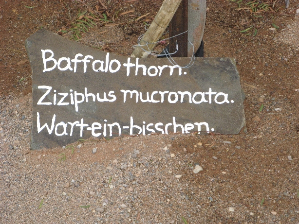 „Wart-ein-bisschen oder Omukaru (Ziziphus mucronata) Dieser Baum ist eine Pflanzenart aus der Familie der Kreuzdorngewächse (Rhamnaceae). Seinen Namen verdankt dieser wehrhafte Baumbusch dem Umstand, dass er dem eiligen Wanderer gerne mit seinen tückischen Krummdornen den Hut vom Kopf zieht oder das Hemd beim Vorbeigehen zerreißt. Diese Eigenschaft macht ihn auch zu einer beliebten Heckenpflanze.“