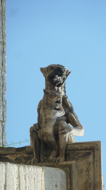 Ein schönes Beispiel dadaistischer Figuren bietet die Kathedrale Saint-Siffrein in Carpentras. Hier abgebildet eine Drachen-Mutter mit ihrem Drachen-Kind.
